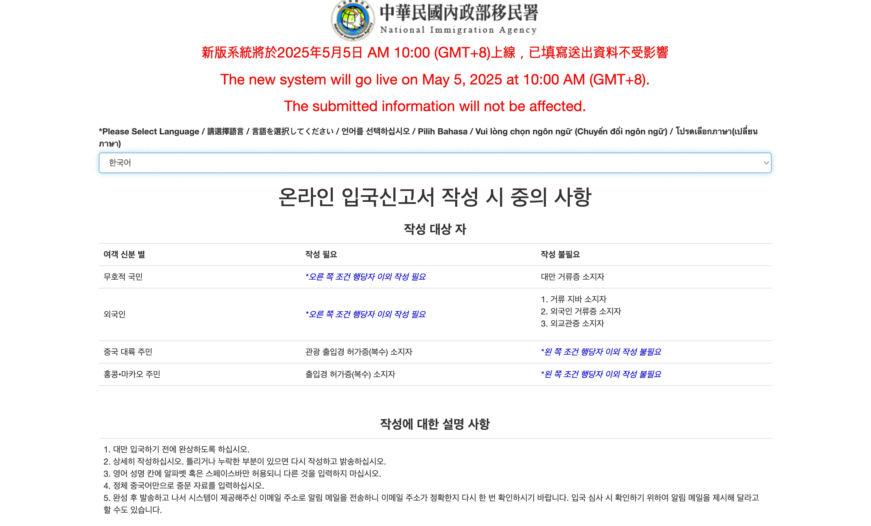 - 작성 사이트: https://niaspeedy.immigration.gov.tw/webacard/index